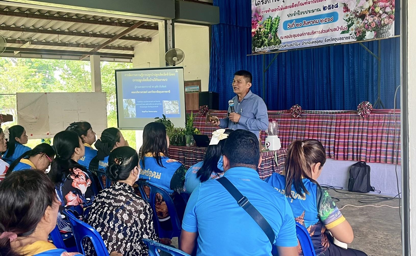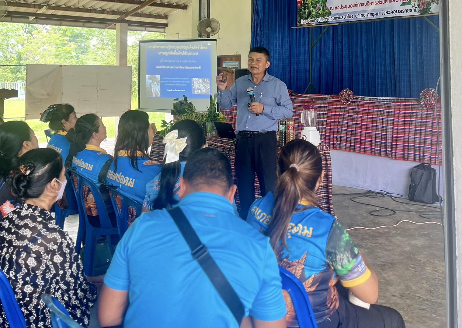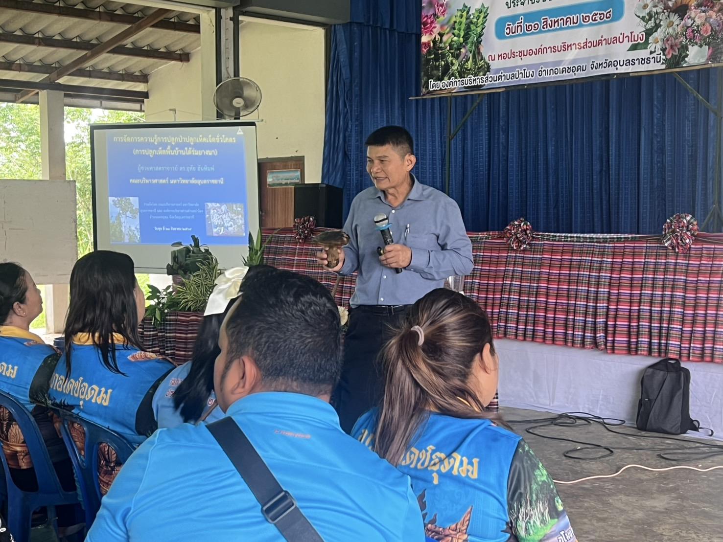 เมื่อวันที่ 21 สิงหาคม 2568 คณะบริหารศาสตร์ มหาวิทยาลัยอุบลราชธานี ได้จัดโครงการบริการวิชาการ “ปลูกเห็ดใต้ร่มยางนา เพื่อเพิ่มรายได้ให้ชุมชน” ณ พื้นที่องค์การบริหารส่วนตำบลป่าโมง อำเภอเดชอุดม จังหวัดอุบลราชธานี โดยได้รับเกียรติจาก ผู้ช่วยศาสตราจารย์ ดร.อุทัย อันพิมพ์ คณบดีคณะบริหารศาสตร์ เป็นวิทยากรบรรยายและถ่ายทอดองค์ความรู้แก่ชาวบ้านและผู้สนใจในพื้นที่