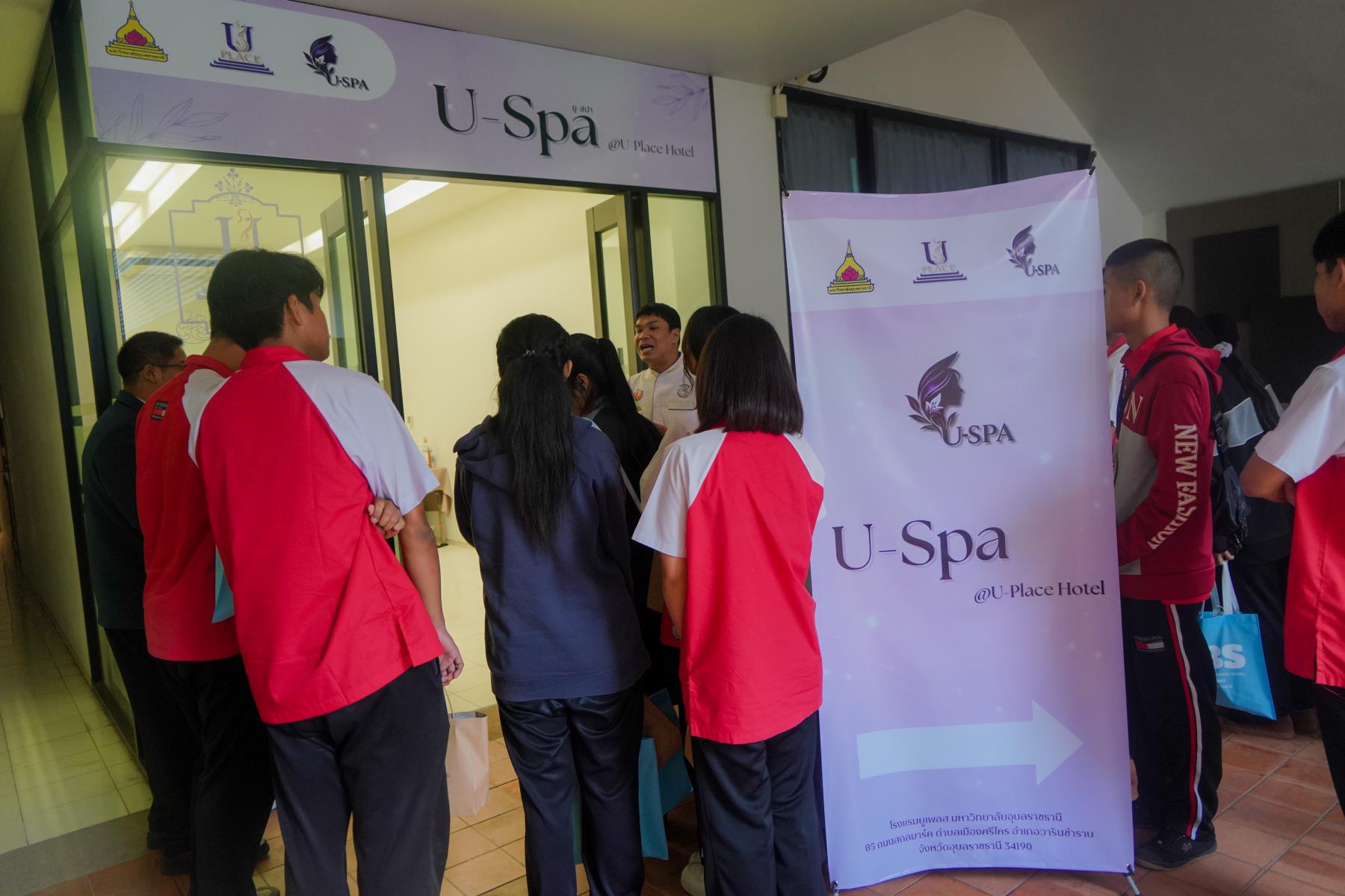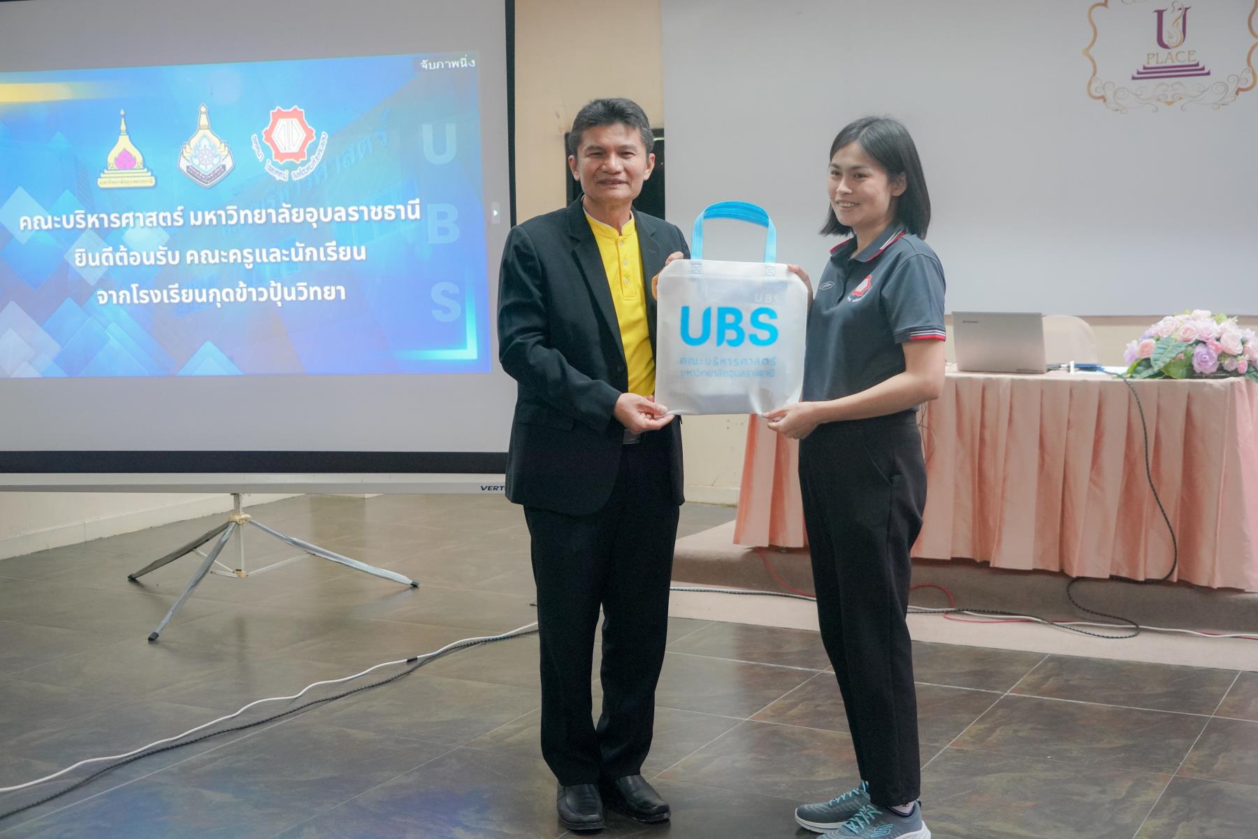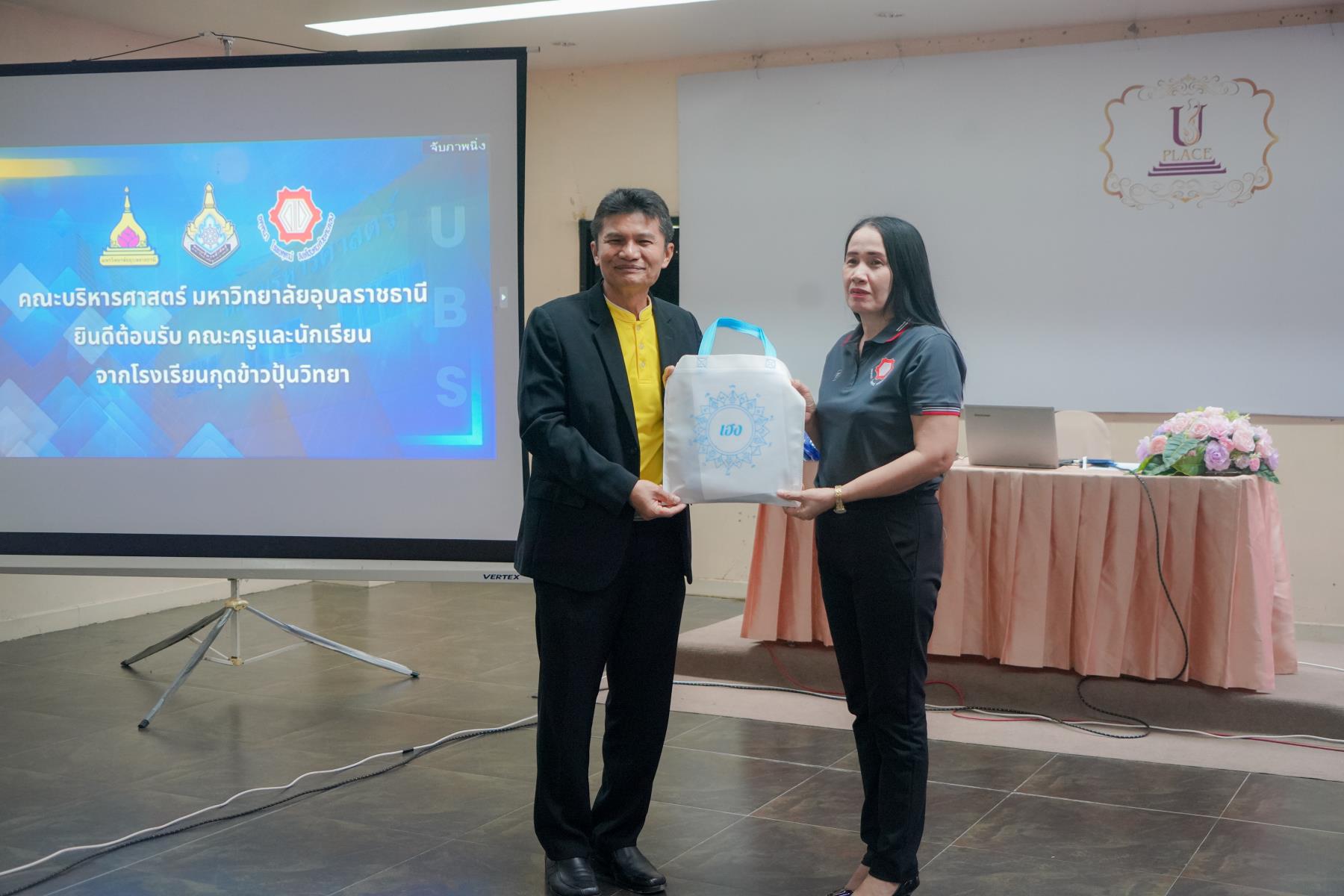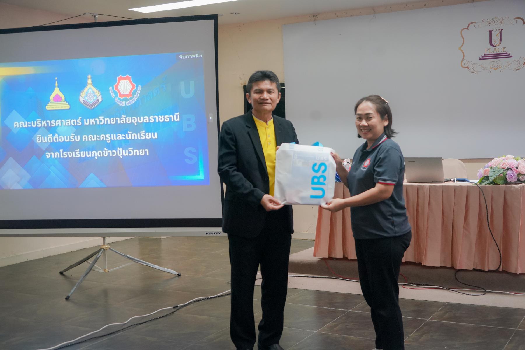 การต้อนรับจัดขึ้น ณ ห้องประชุม U2 โรงแรมยูเพลส มหาวิทยาลัยอุบลราชธานี โดยมี ผู้ช่วยศาสตราจารย์ ดร.อุทัย อันพิมพ์ คณบดีคณะบริหารศาสตร์ และ ดร.สายรุ้ง สังวาลย์ ผู้ช่วยคณบดีฝ่ายสื่อสารองค์กรและกิจการต่างประเทศ เป็นผู้กล่าวต้อนรับ ภายหลังการบรรยายแนะแนว อาจารย์ภูริชญ์ แสนพินิจ นันทะเสน ได้นำคณะครูและนักเรียนเข้าเยี่ยมชม ห้องปฏิบัติการเรียนการสอนและห้องต่าง ๆ ภายในโรงแรมยูเพลส ซึ่งเป็นสถานที่ฝึกปฏิบัติจริงของนักศึกษาสาขานวัตกรรมการจัดการโรงแรมและการบริการ