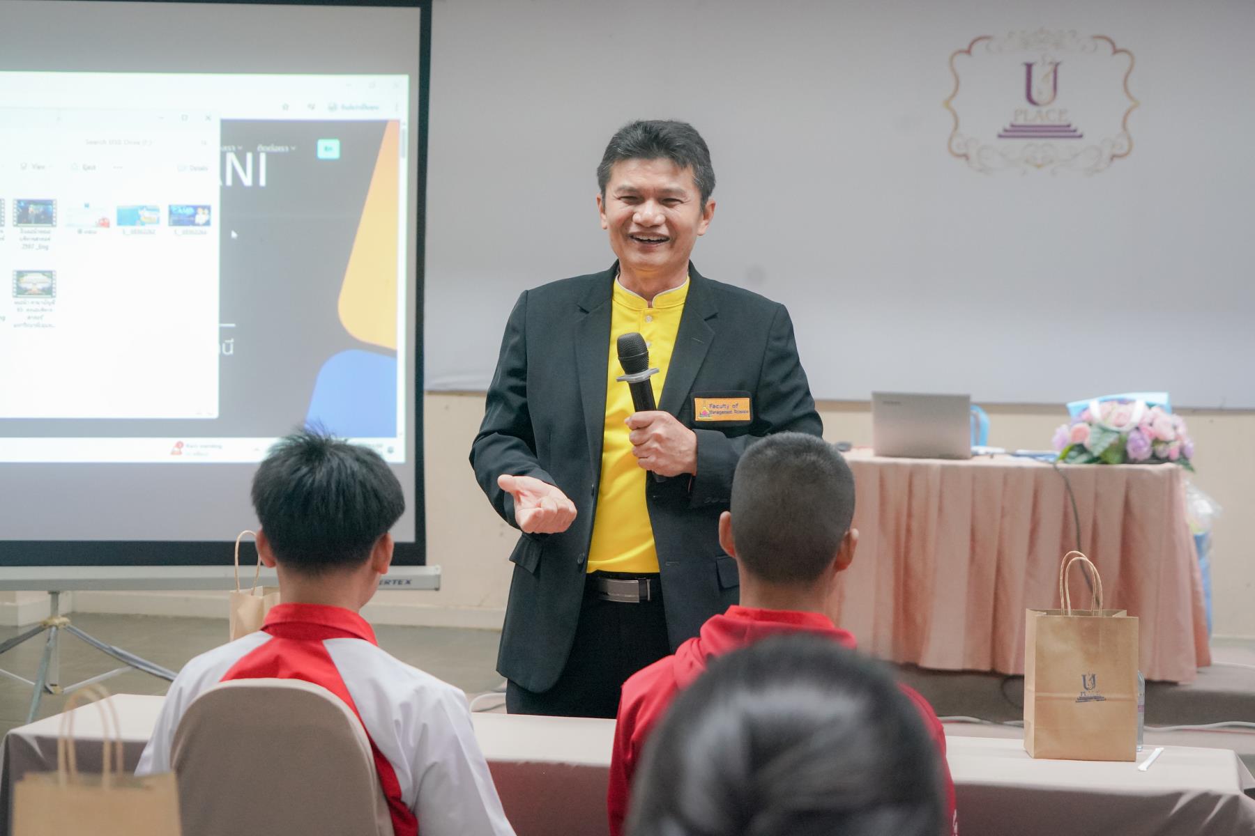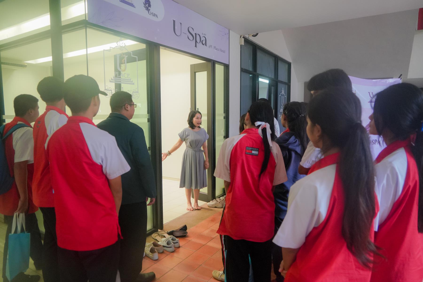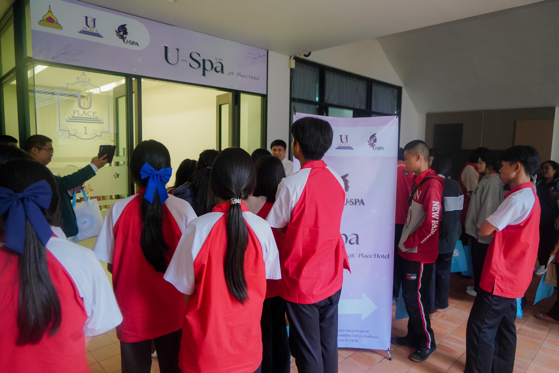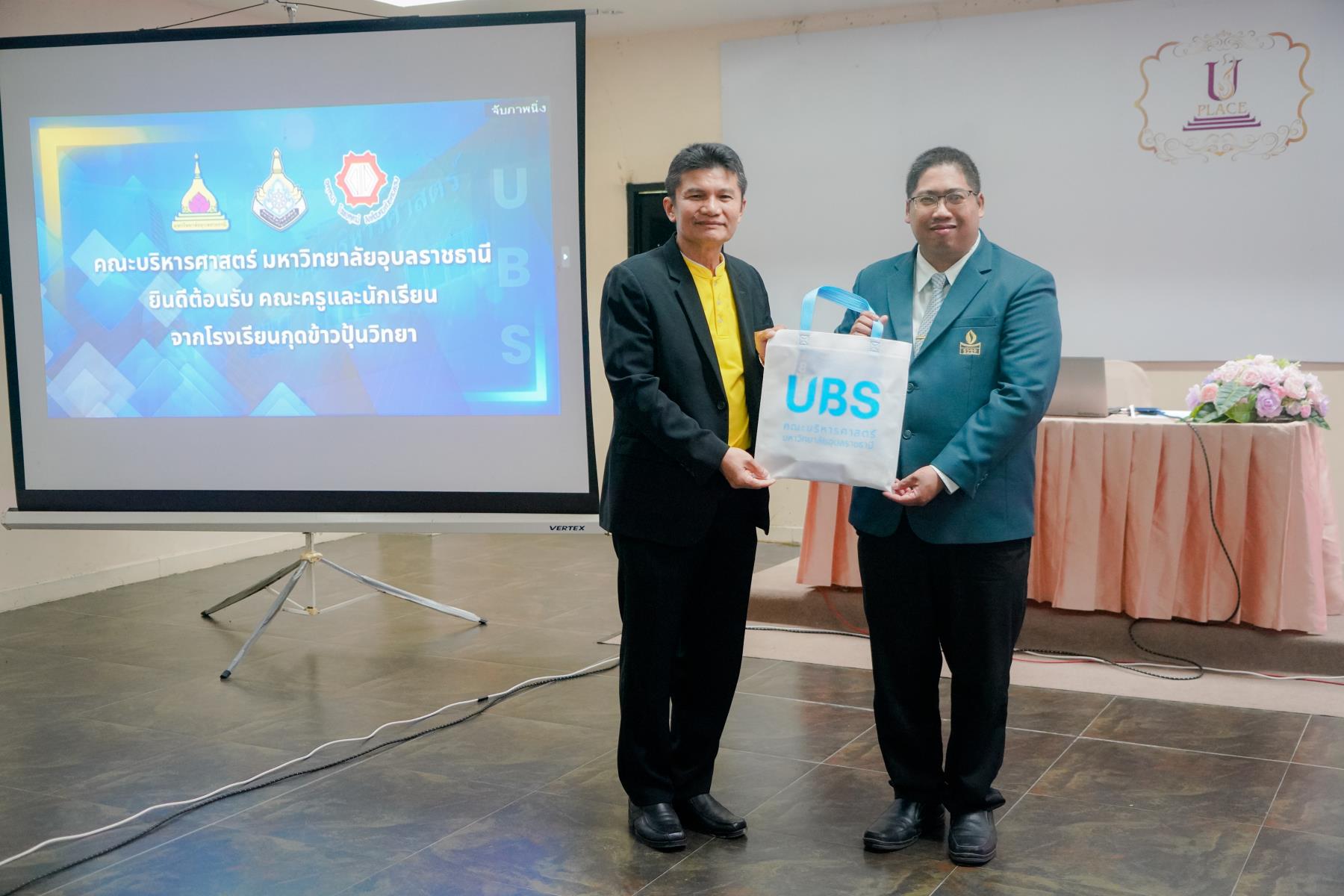 การต้อนรับจัดขึ้น ณ ห้องประชุม U2 โรงแรมยูเพลส มหาวิทยาลัยอุบลราชธานี โดยมี ผู้ช่วยศาสตราจารย์ ดร.อุทัย อันพิมพ์ คณบดีคณะบริหารศาสตร์ และ ดร.สายรุ้ง สังวาลย์ ผู้ช่วยคณบดีฝ่ายสื่อสารองค์กรและกิจการต่างประเทศ เป็นผู้กล่าวต้อนรับ ภายหลังการบรรยายแนะแนว อาจารย์ภูริชญ์ แสนพินิจ นันทะเสน ได้นำคณะครูและนักเรียนเข้าเยี่ยมชม ห้องปฏิบัติการเรียนการสอนและห้องต่าง ๆ ภายในโรงแรมยูเพลส ซึ่งเป็นสถานที่ฝึกปฏิบัติจริงของนักศึกษาสาขานวัตกรรมการจัดการโรงแรมและการบริการ