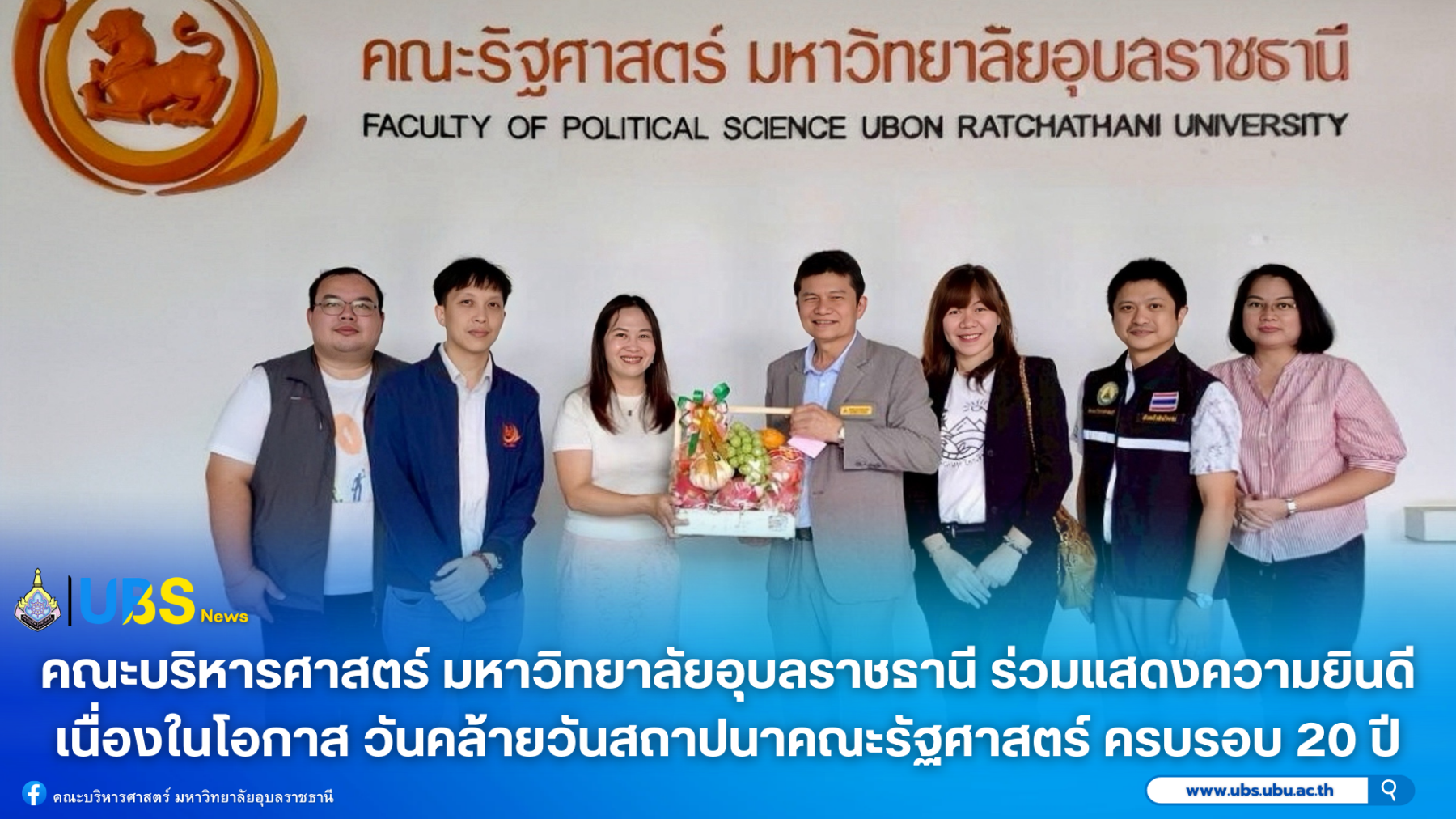 เมื่อวันที่ 19 กันยายน 2568 คณะบริหารศาสตร์ มหาวิทยาลัยอุบลราชธานี นำโดย ผู้ช่วยศาสตราจารย์ ดร.อุทัย อันพิมพ์ คณบดีคณะบริหารศาสตร์ พร้อมด้วยคณะผู้บริหารและบุคลากร ร่วมแสดงความยินดี เนื่องในโอกาสวันคล้ายวันสถาปนาคณะรัฐศาสตร์ ครบรอบ 20 ปี ณ อาคารปฏิบัติการรวมทางสังคมศาสตร์ มหาวิทยาลัยอุบลราชธานี