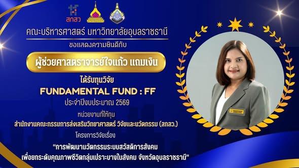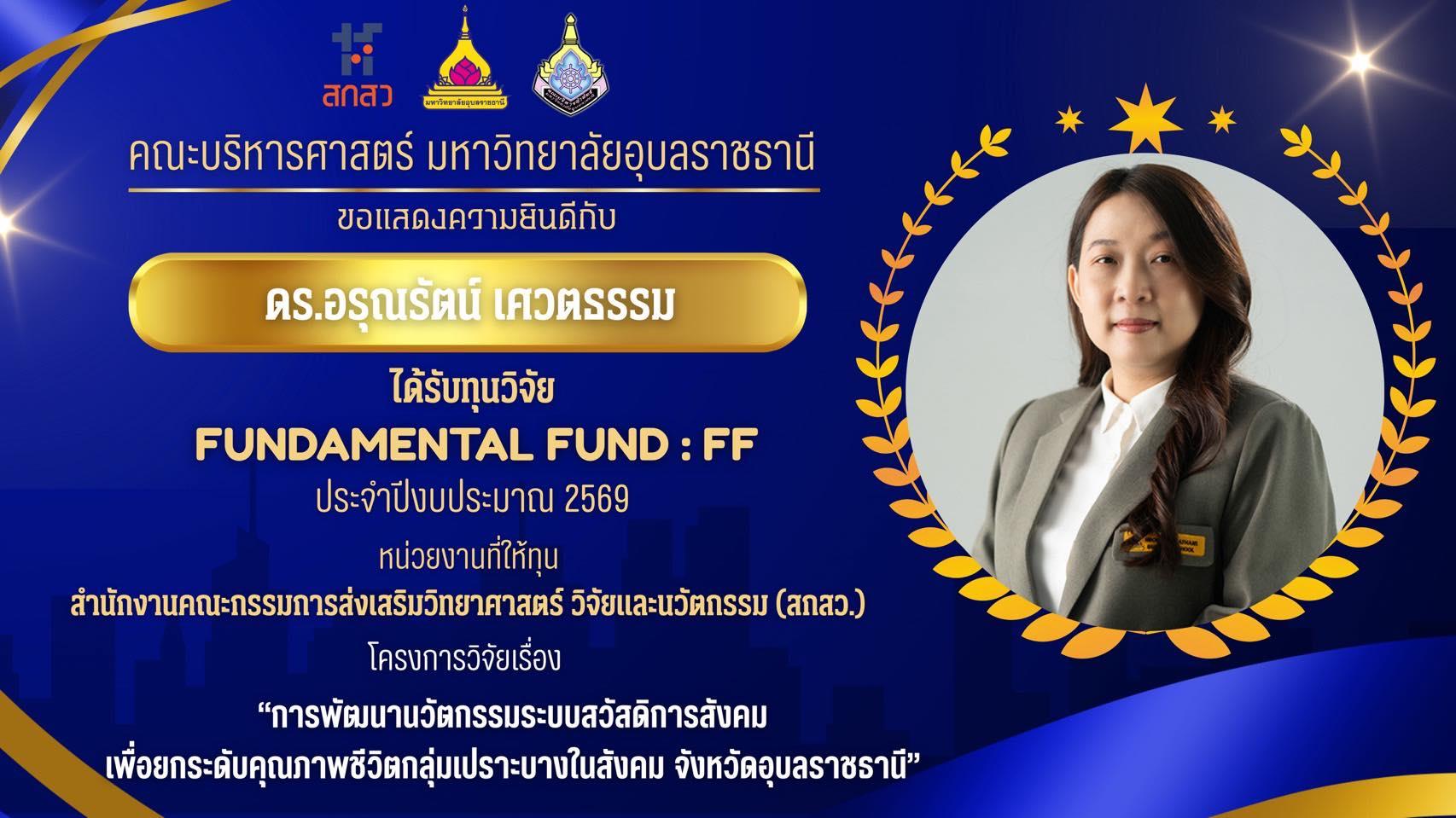 คณะบริหารศาสตร์ขอแสดงความยินดีกับ รศ.ดร.รุ่งรัศมี บุญดาว ผศ.ใจแก้ว แถมเงิน และ ดร.อรุณรัตน์ เศวตธรรม ในโอกาสที่ได้รับทุนวิจัย Fundamental Fund (FF) ประจำปีงบประมาณ 2569 จากสำนักงานคณะกรรมการส่งเสริมวิทยาศาสตร์ วิจัยและนวัตกรรม (สกสว.)